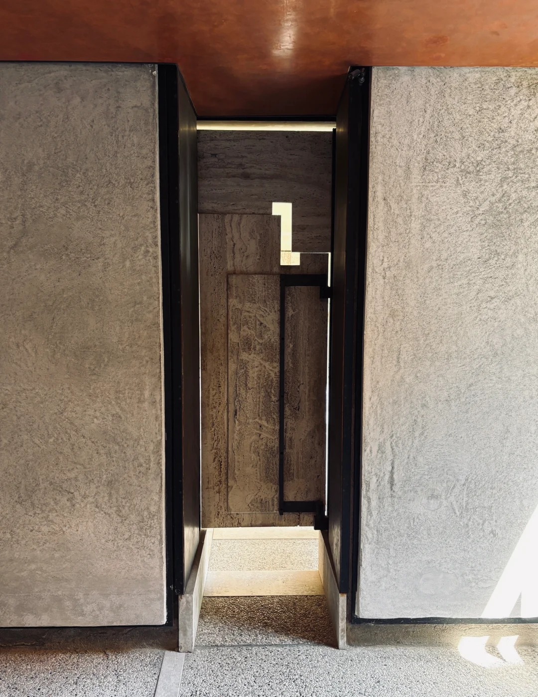 各个居室的大小和形状,考虑到房间的用途和房间之间的关系、与周边环境的联系,进行了最优化,结果产生了平面的、剖面的错位。此外,使其轮廓线从客厅、餐厅中可见,并通过有意错开基础、柱、梁、框、门窗等要素的装饰线来强调。另外,对于饰面材料,工匠用钉子直接固定,涂装也采用了能够体现基底特性的材料,这样就不会掩盖不均匀的现象。通常的作法会尽量排除无法被控制的线条和要素,但是在这个住宅中,通过有意地表现由于错位和不均匀而无法完结的东西,在隔断的深处、错位线的前方、物体的深层带来想象力发挥作用的效果,以创造空间的扩展和纵深为目标。